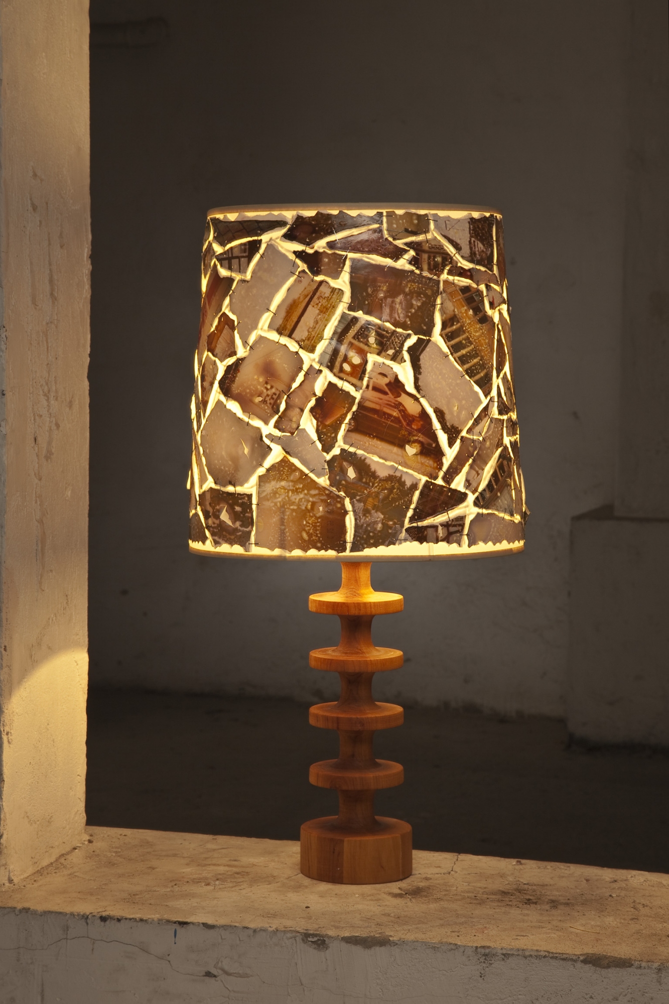 Aus Alt wird Neu: Man nehme alte Fotos, zerrupfe sie, sortiere sie nach Farben und Formen und tackere sie zu einem Mosaik neu zusammen. Nach einer gewissen Sonderbehandlung zur Verfremdung seiner Oberfläche wird es wie eine Haube auf dem Schirm befestigt. Klingt ganz leicht, war aber doch ganz schön kniffelig.