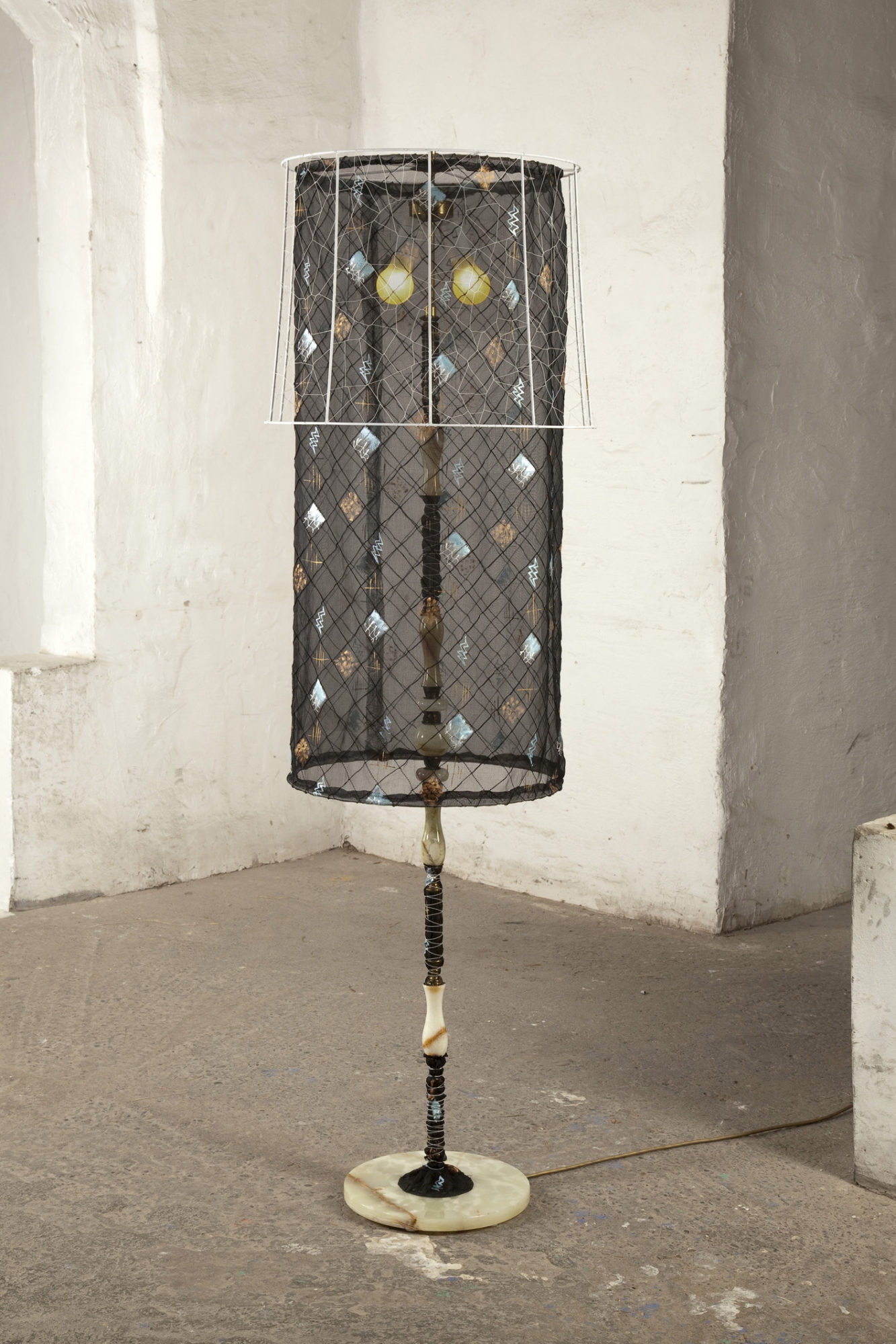 Material: bemalter/ beschriebener Lampenschirm, Holzständer, Stoff