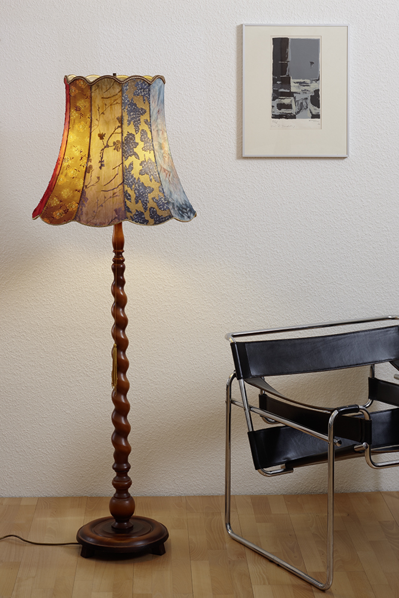 Material: Lampenschirm, Organzastoffe, Klebstoff, Holzständer